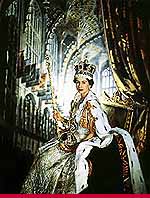 Coronation Succession AccessionThe new sovereign succeeds to the throne as soon as his or her predecessor dies and is at once proclaimed at an Accession Council. All members of the Privy Council are summoned. Members of the House of Lords, the Lord Mayor and aldermen and other leading citizens of the City of London, and High Commissioners of Commonwealth countries are invited to attend.If the monarch is under 18 on succeeding to the Throne, there is provision for a regent to be appointed to perform the royal functions. This can also happen if the monarch is totally incapacitated. CoronationThe coronation of the new sovereign follows the accession after a convenient interval. The ceremony has remained essentially the same over a thousand years.The ceremony takes place at Westminster Abbey. The service is conducted by the Archbishop of Canterbury in the presence of representatives of the Houses of Parliament, Church and State. Prime Ministers and leading citizens from the Commonwealth and representatives of other countries also attend. During the ceremony the monarch takes an oath to rule according to law. This is followed by the anointing and crowning. After homage is paid by the Archbishop of Canterbury and senior peers, Holy Communion is celebrated. The Queen's Coronation took place on 2 June 1953 following her accession on 6 February 1952. |