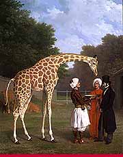 One of the inhabitants of the Royal Menagerie was the Nubian giraffe which was given to George IV by Mehemet Ali, the Pasha of Egypt, in 1827. The giraffe arrived in a weakened state from Cairo at Waterloo Bridge on 11 August. The giraffe was accompanied by two Egyptian cows and two Arab keepers. By October an animal painter had been commissioned to paint the giraffe with its keepers in the special paddock created within the menagerie. The giraffe, which had never really thrived, died in the autumn of 1829. |