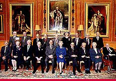 The Queen and The Duke of Edinburgh with members of the Order of Merit, at Windsor Castle, 1997. With only 24 members, the Order is conferred on people who have achieved distinction in the arts, learning, literature and science © PA News Photo Library |