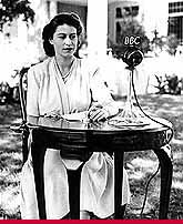 The Queen, as Princess Elizabeth, broadcasting from the gardens of Government House, Cape Town, South Africa, 21 April 1947 Topical Press, Royal Archives |