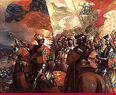 Edward II (reigned 1307-27) had few of the qualities which made a successful medieval king. He surrounded himself with favourites, and the barons, feeling excluded from power, rebelled. Throughout his reign different baronial groups struggled to gain power and control the King. The nobles' Ordinances of 1311, which attempted to limit royal control of finance and appointments, were ignored by Edward. Large debts (many inherited) and the Scots' victory at Bannockburn made Edward more unpopular. Finally, in 1326, Edward's wife, Isabelle of France, led an invasion against her husband. In 1327 Edward was made to renounce the throne in favour of his son, Edward, and was later murdered at Berkeley Castle. |